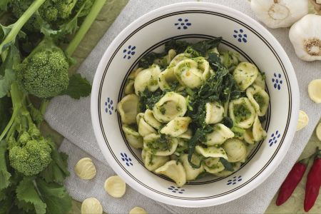 For this recipe you can use fresh or dried Orecchiette pasta, which is made from semolina. The turnip tops are cooked with the Orecchiette so that the pasta takes on some of their flavour straight away. Then, they are stir fried in olive oil, garlic, anchovies and a pinch of chilli.